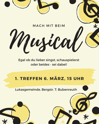 Dieses Jahr ist das Musicalprojekt eine Kooperation der Lukasgemeinde, der katholischen Gemeinde Maria Heimsuchung aus Bubenreuth und der St. Laurentiusgemeinde aus Möhrendorf. Herzliche Einladung an alle drei Gemeinden! 😊